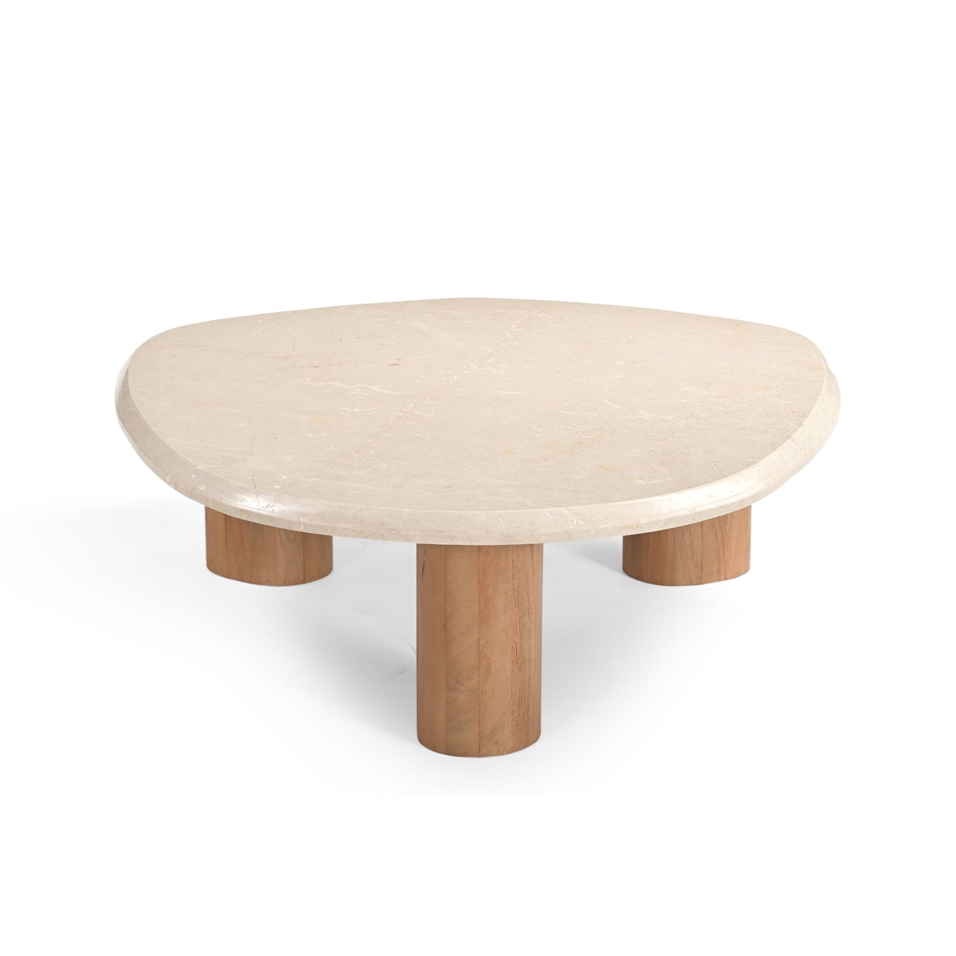 Salontafel Nuvé van mangohout met Botticino marmeren blad. Organische vorm, stevige houten poten. Lichte marmer en mangohout voor rustige uitstraling. Afmetingen: 100x90x30cm. Zelfmontage, onderhoud met vochtige doek.